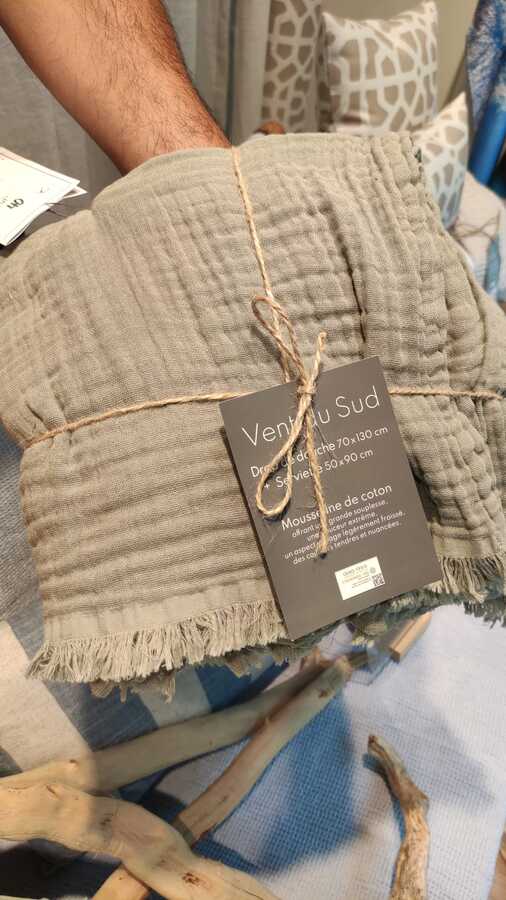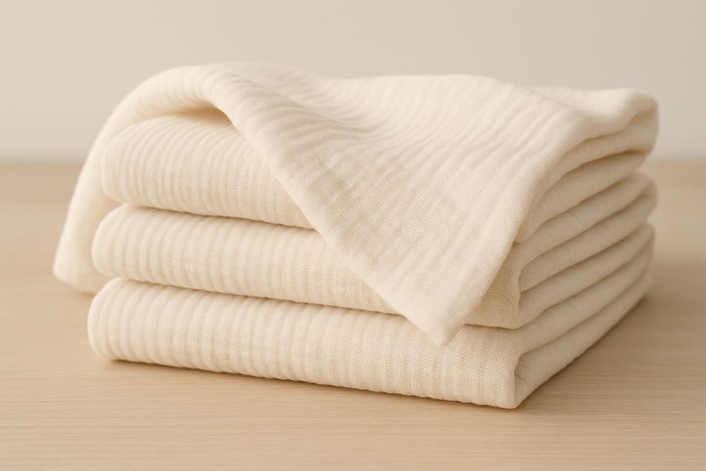 Las toallas de muselina están confeccionadas con una tela muy ligera, generalmente de algodón, aunque también puede encontrarse en versiones de seda o lana. Es un tejido de fibras naturales, reconocible por su tacto suave y su aspecto ligeramente arrugado. Al estar tejida de forma abierta, permite una buena transpiración y, a la vez, una absorción eficaz.